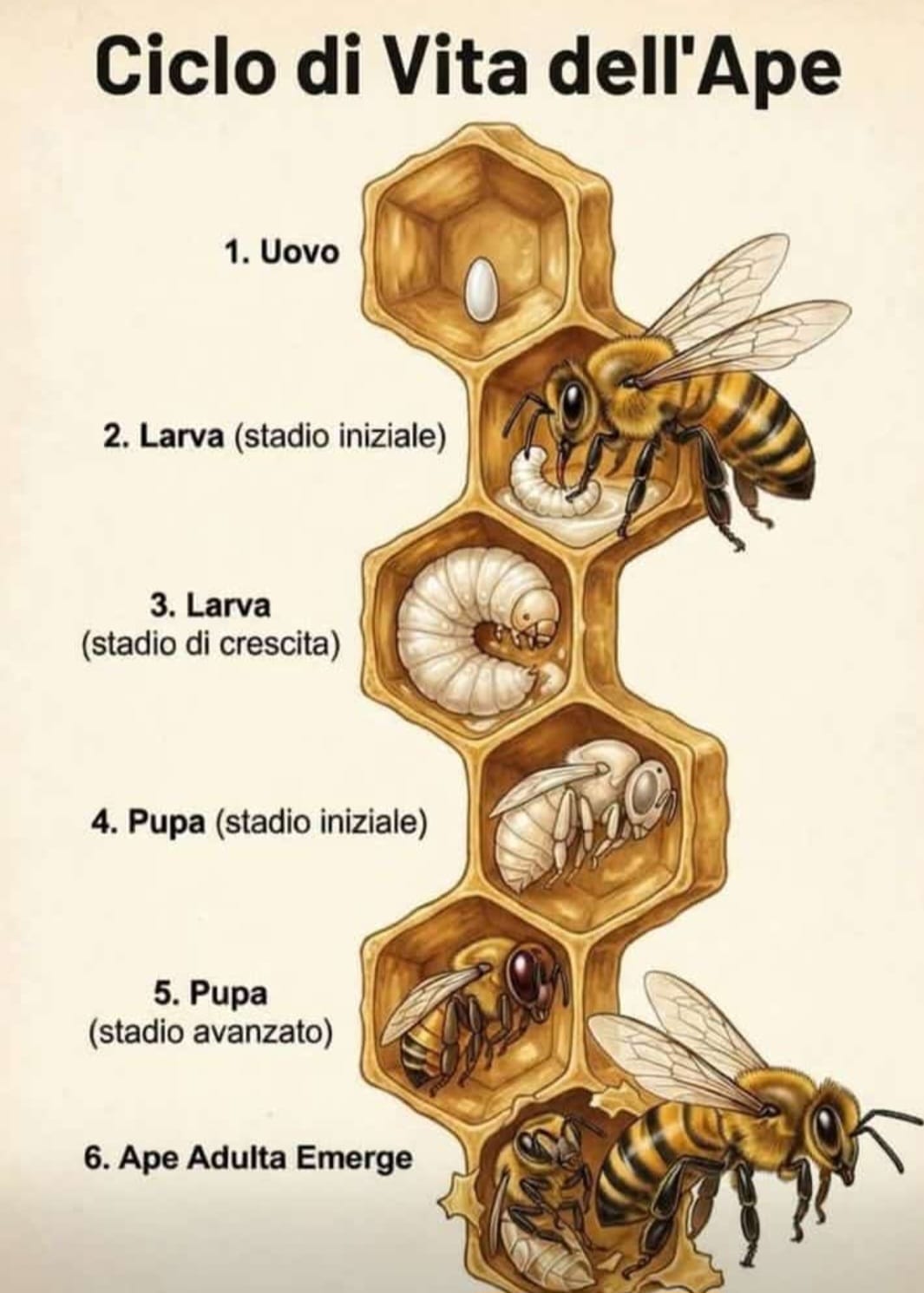 L'ape adulta uscirà dalla cella e per 20gg si renderà utile alla famiglia ricoprendo vari compiti finché sarà pronta per volare e rientrare portando il polline.